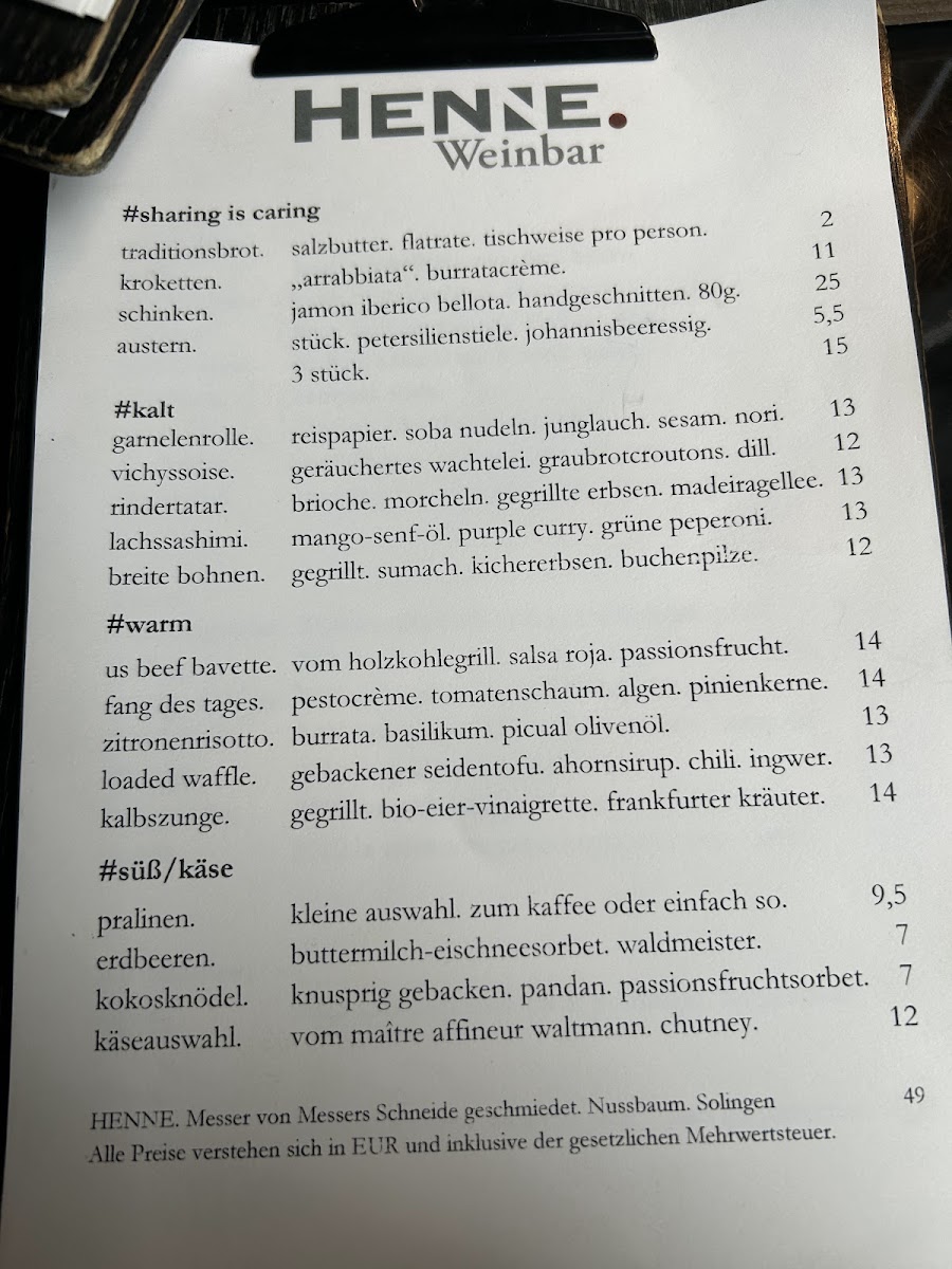 If you find yourself in Cologne, don’t miss the opportunity to visit HENNE. Weinbar. Whether you’re a fan of traditional flavors or in search of creative culinary experiences, this restaurant promises to impress with every sip and bite.